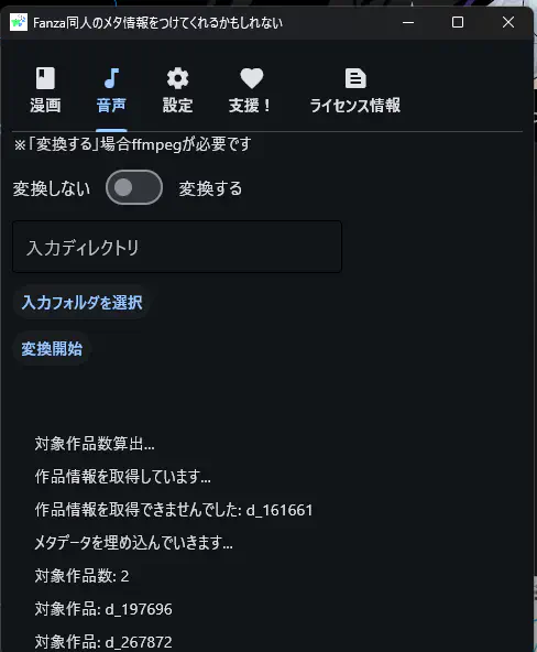 あと、別の人がDLsiteの音声作品に情報を入れたりファイル形式を変換してくれるプログラムを公開していて、それがすごく便利だったので…自分が作ったものも公開してみよ!っとなった。